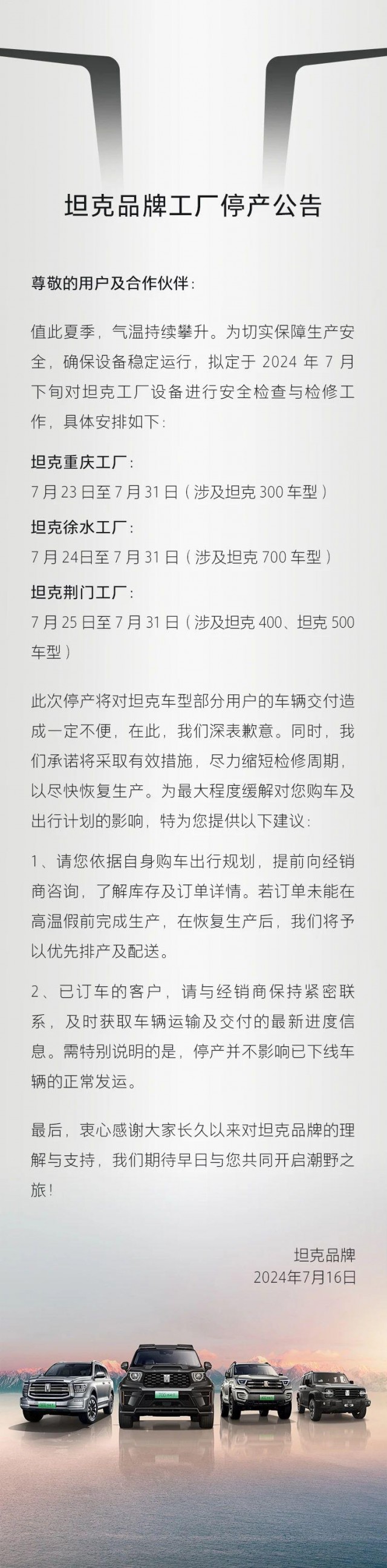 日前,长城汽车坦克品牌发布公告,值此夏季,气温持续攀升。为切实保障生产安全,确保设备稳定运行,拟定于2024年7月下旬对坦克工厂设备进行安全检查与检修工作,具体安排如下: