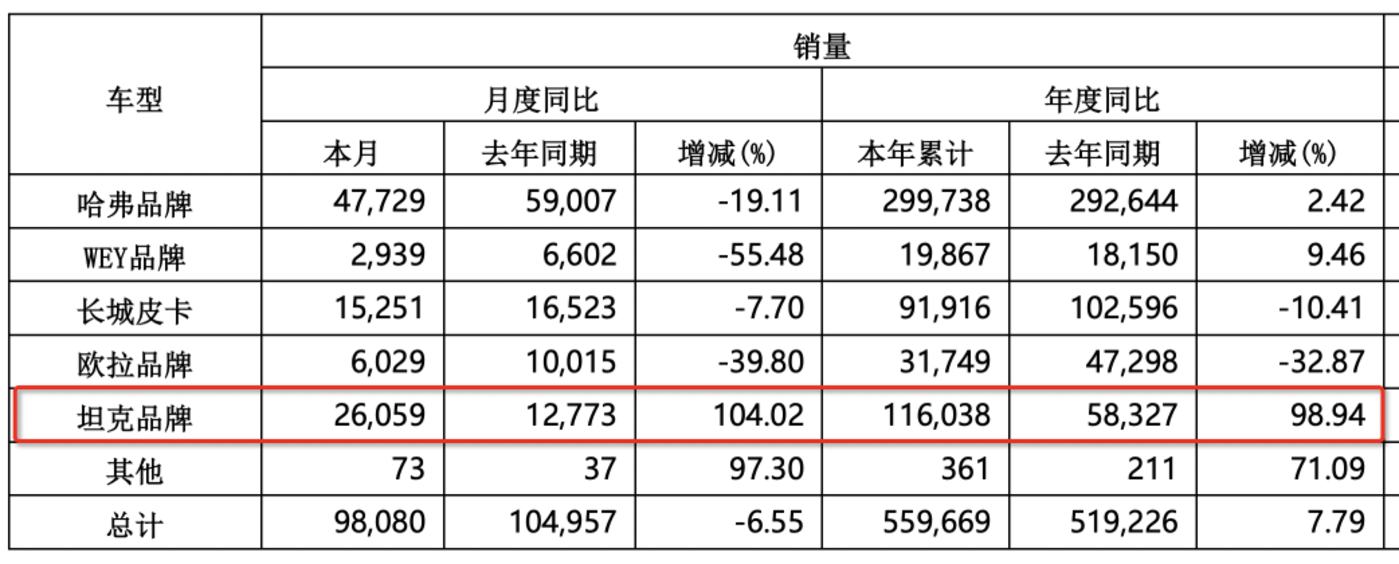 数据显示,坦克品牌在 2024 年上半年的销量同比增加了 98.94%,将近翻倍;考虑到坦克品牌的售价区间覆盖到 20 万到 70 万区间。所以,我们有理由确信,坦克品牌是不言而喻的销量和利润大功臣。