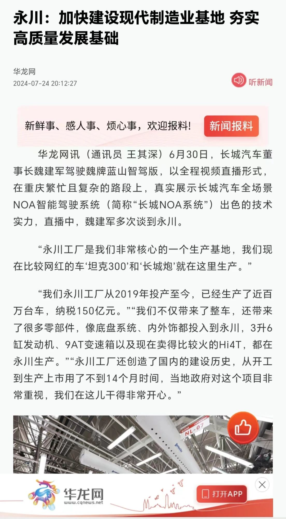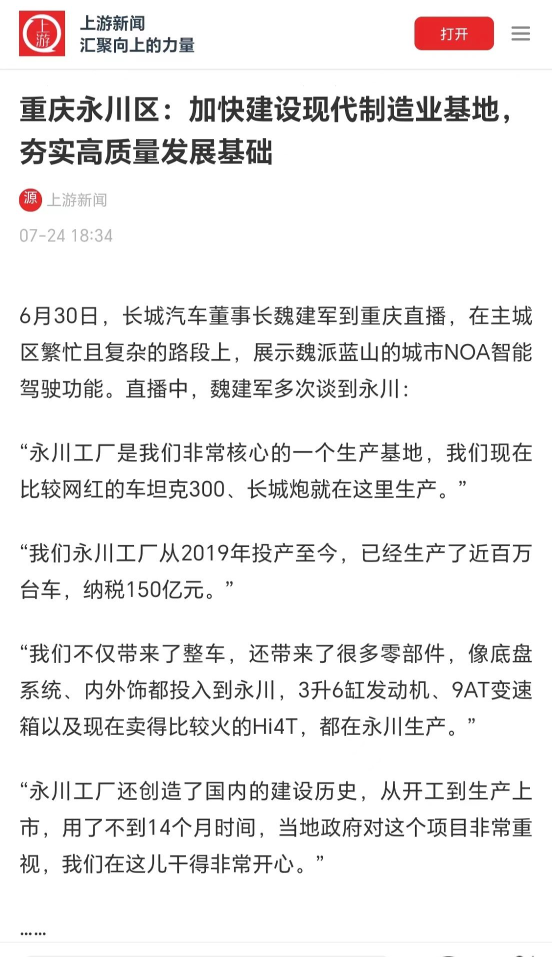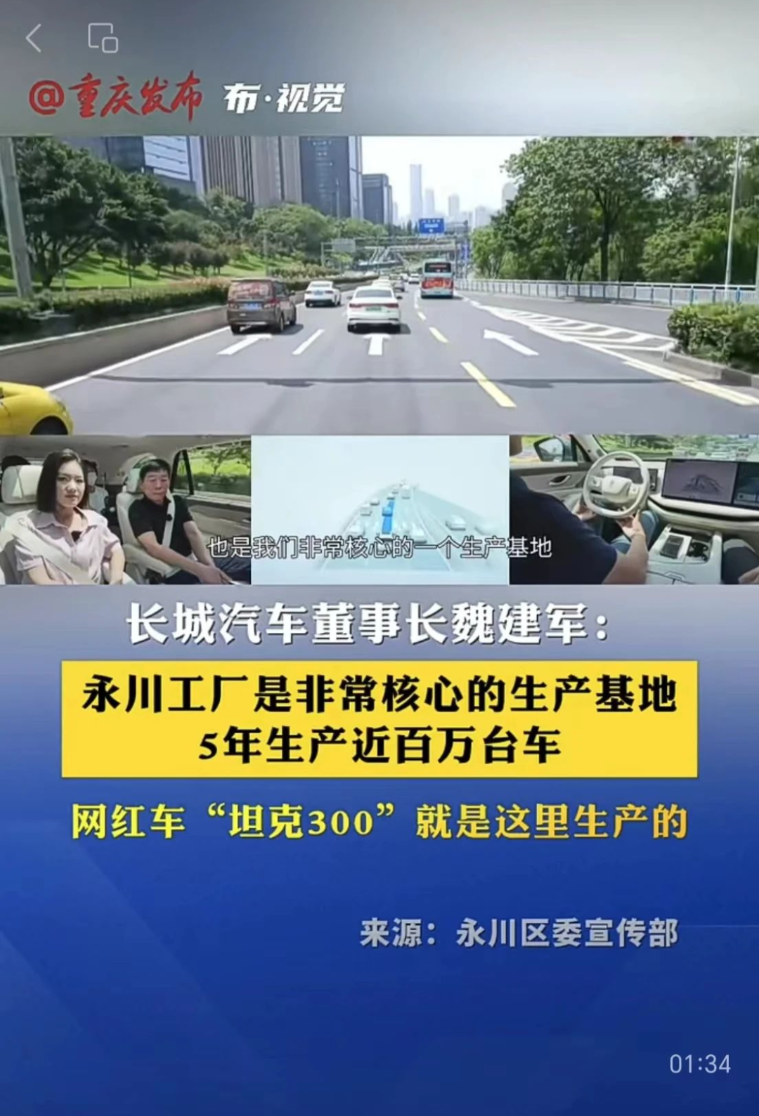 近日,长城汽车董事长魏建军驾驶魏牌蓝山智驾版,以全程视频直播形式,在重庆繁忙且复杂的路段上,真实展示长城汽车全场景NOA智能驾驶系统(简称“长城NOA系统”)出色的技术实力,直播中,魏建军多次谈到永川。
