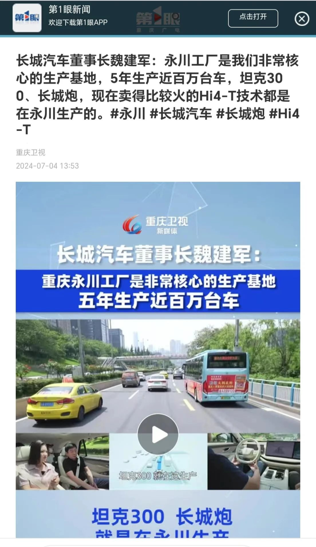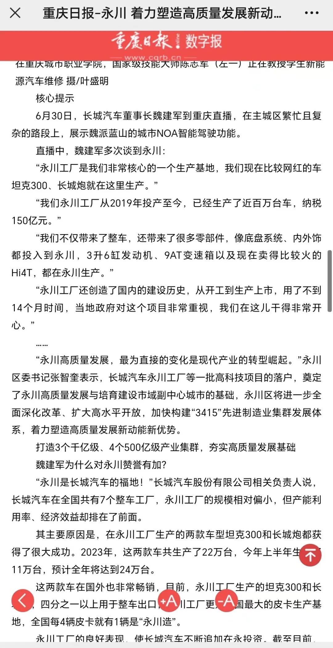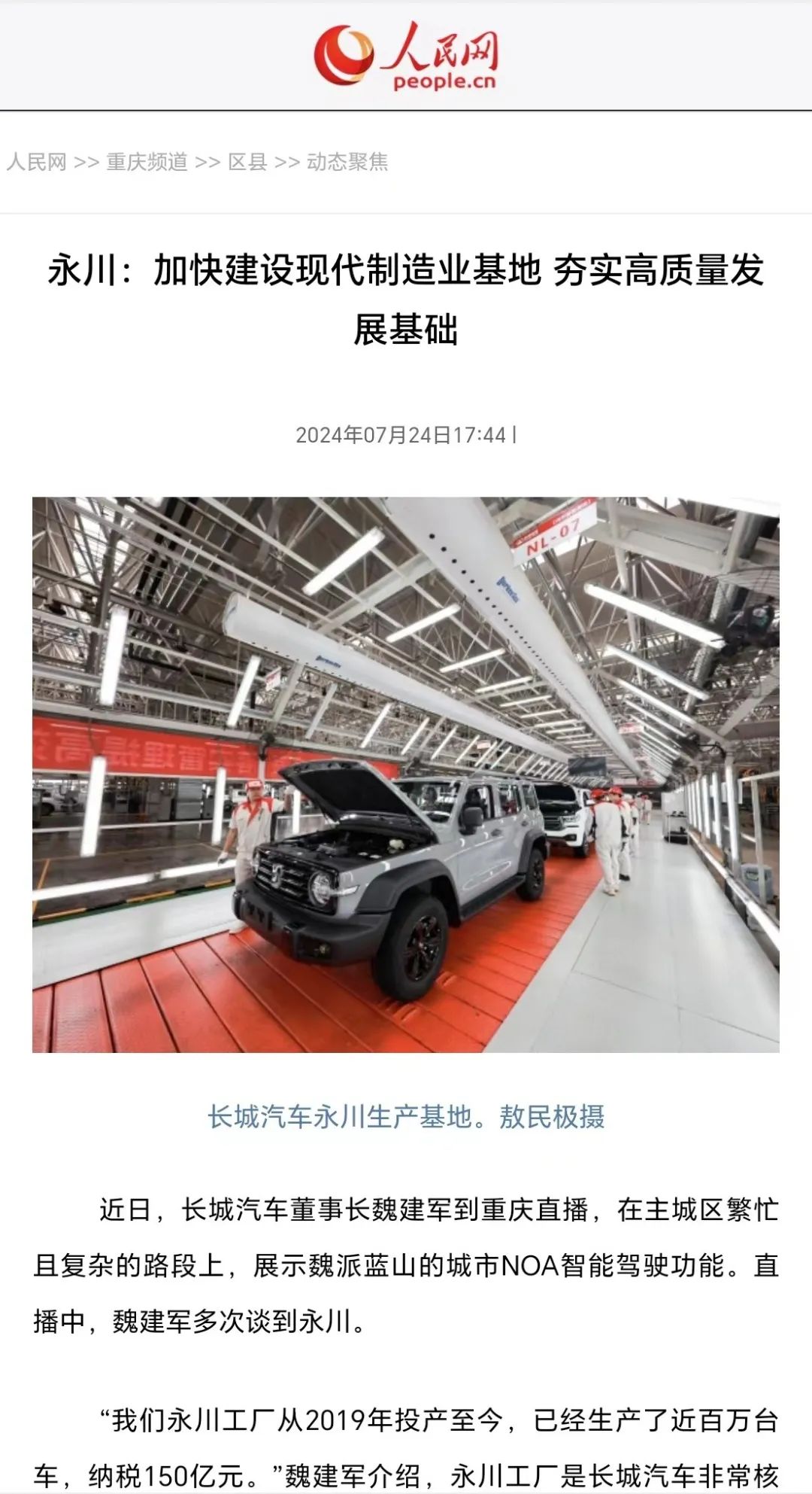近日,长城汽车董事长魏建军驾驶魏牌蓝山智驾版,以全程视频直播形式,在重庆繁忙且复杂的路段上,真实展示长城汽车全场景NOA智能驾驶系统(简称“长城NOA系统”)出色的技术实力,直播中,魏建军多次谈到永川。