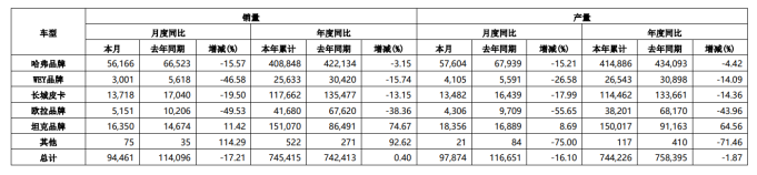 根据披露的8月产销数据,长城汽车8月份实现销量9.45万辆,同比下滑17.21%;1-8月累计实现销量74.54万辆,同比微增0.4%。