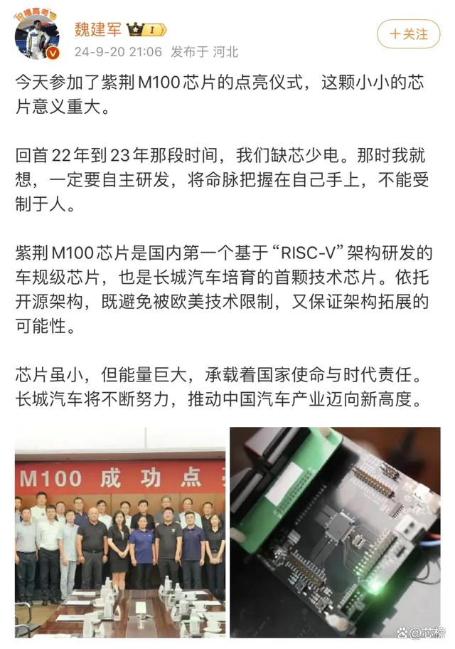 出席点亮仪式的有长城汽车股份有限公司董事长魏建军,北京开源芯片研究院首席科学家包云岗,国家新能源汽车技术创新中心董事长续超前,南京江北新区党工委委员、管委会副主任陈文斌,南京江北新区研创园党工委书记、管办主任吴恒等。???9月20日,魏建军发文,称紫荆M100芯片是国内第一个基于“RISC-V”架构研发的车规级芯片,也是长城汽车培育的首颗技术芯片。