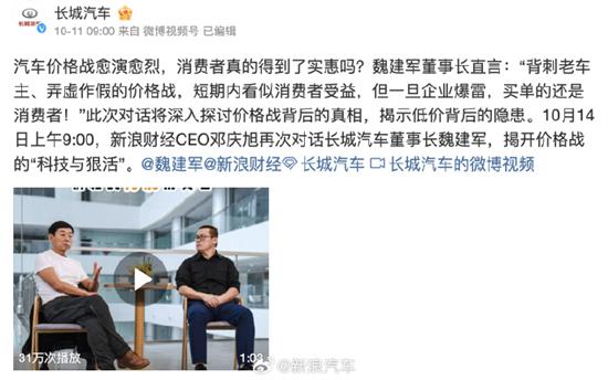新浪财经CEO邓庆旭再次对话长城汽车董事长魏建军,揭开价格战的“科技与狠活”。据介绍,访谈节目视频将于10月14日上午9:00公开完整版。预告片中,魏建军表示弄虚作假的价格战。一旦爆雷,消费者的权益无法保障。其次,魏建军还提到了现在汽车续航虚标问题,即使以便宜的价格买到了车,最终消费者还是会被当成“韭菜”来割。