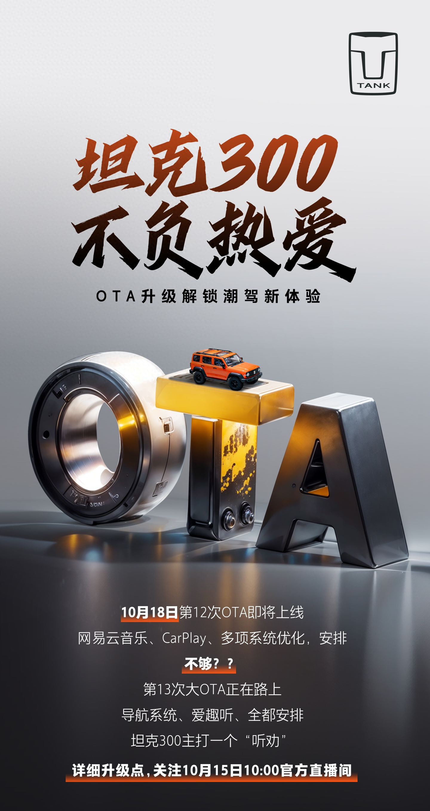 IT之家 10 月 14 日消息,长城汽车旗下坦克 SUV 官微今天宣布,坦克 300 的第 12 次 OTA 将于 10 月 18 日推送,新增对 CarPlay、网易云音乐的支持,以及多项系统优化功能。