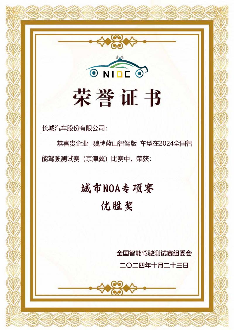 10月21日—23日,由中国国际贸易促进委员会机械行业分会和中关村京津冀新能源汽车协同发展促进会联合主办的2024全国智能驾驶测试赛(京津冀)在北京举行。作为国内智能汽车领域的头部赛事,此次大会汇聚了智能驾驶领域最新的技术和产品。大赛专家评审团由两大院士牵头,近30 位行业权威专家和学者组成,从第三方角度出发,真实、客观公正的对参赛车辆进行评比。搭载长城汽车最新一代智能驾驶系统Coffee Pilot Ultra的魏牌全新蓝山在城市NOA专项赛中荣获优胜奖。