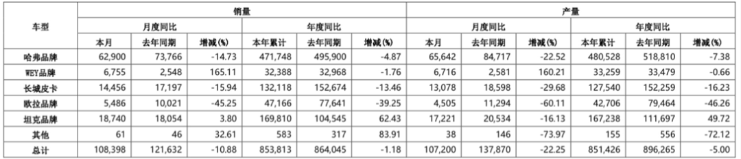 最新产销数据显示,长城汽车9月销量为10.84万辆,同比下滑10.88%,已连续五个月同比下跌。今年1—9月,公司累计销量为85.38万辆,同比下滑1.18%。