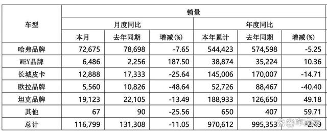 10月份长城汽车共计销量116799辆,同比去年下滑11.05%,今年1到10月累计销量97万多辆,同比下滑2.49%!作为对比比亚迪前十个月销量已经超过320万辆,奇瑞汽车前十个月销量超过了200万辆,吉利汽车前十个月销量超过了170万辆!当然了车卖家并没有贬低长城汽车的意思,而是希望看到差距去追赶!
