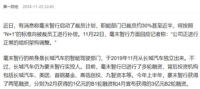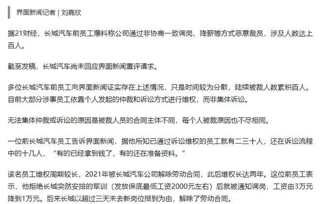 据爆料,长城汽车通过非协商一致调岗、降薪等隐蔽方式,悄然展开了裁员行动,波及数百名员工。更令人担忧的是,这种裁员趋势并非孤立事件,长城汽车旗下公司毫末智行也早已启动了大幅裁员计划,职能部门裁员比例高达30%甚至更多。这一连串的裁员行动,无疑在员工心中投下了巨大的阴影,也让业界对长城汽车的未来发展产生了更多的不确定感。