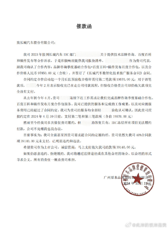 该催款函落款是一家名为“广州原本品牌营销策划有限公司”。催款函称,长城汽车欠该公司40%合同款项39140.00元未支付,已明显违约和违法。