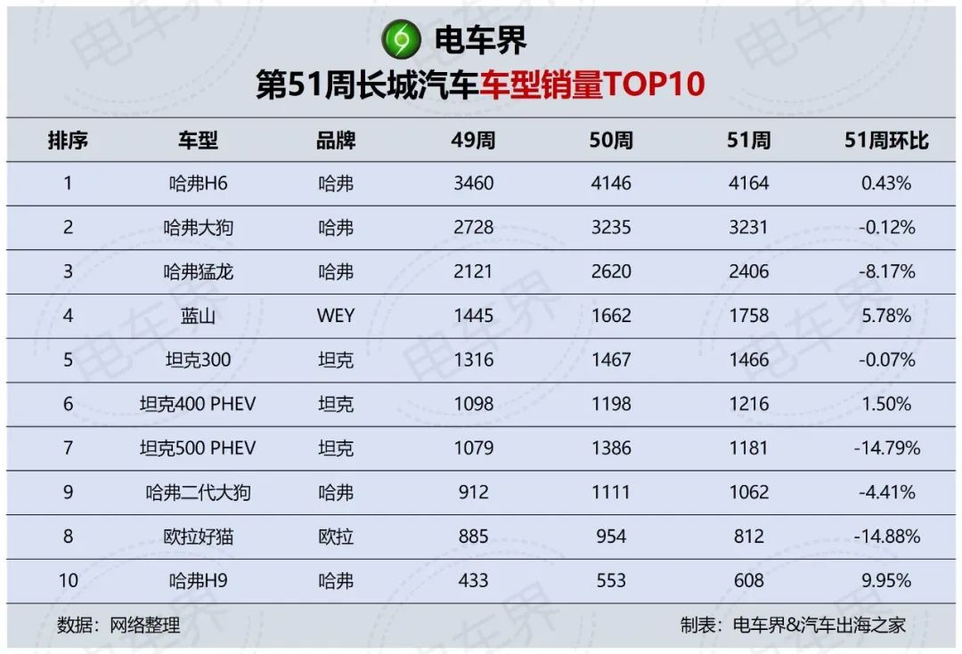 值得注意的是,曾经的SUV王者哈弗H6依然能打,在第51周(4164辆)几乎以一己之力硬撼坦克全系(4247辆),差距仅有83辆。哈弗H6与坦克全系比值为98.05%,为三周最高。