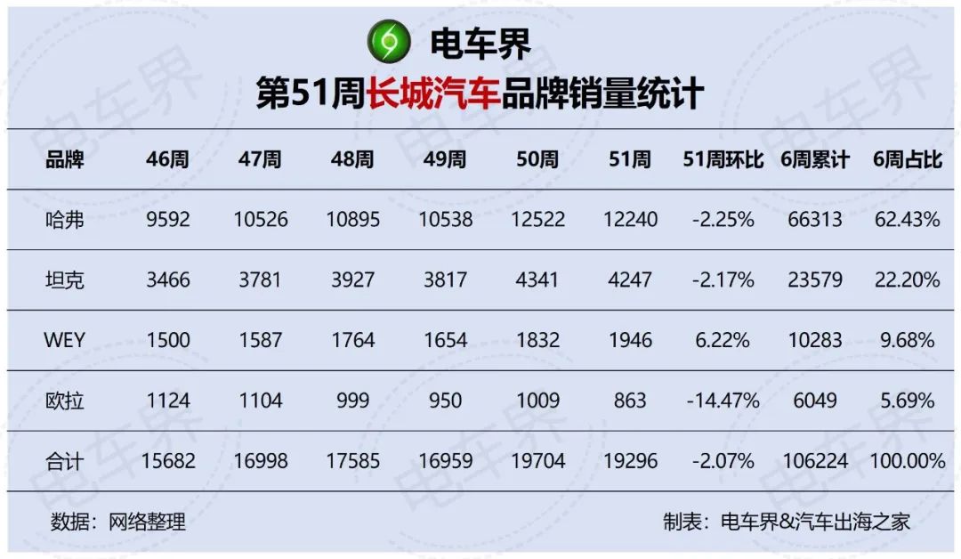 长城汽车第51周(12月16-22日)销量出炉,周销量19296辆,环比下跌2.07%。