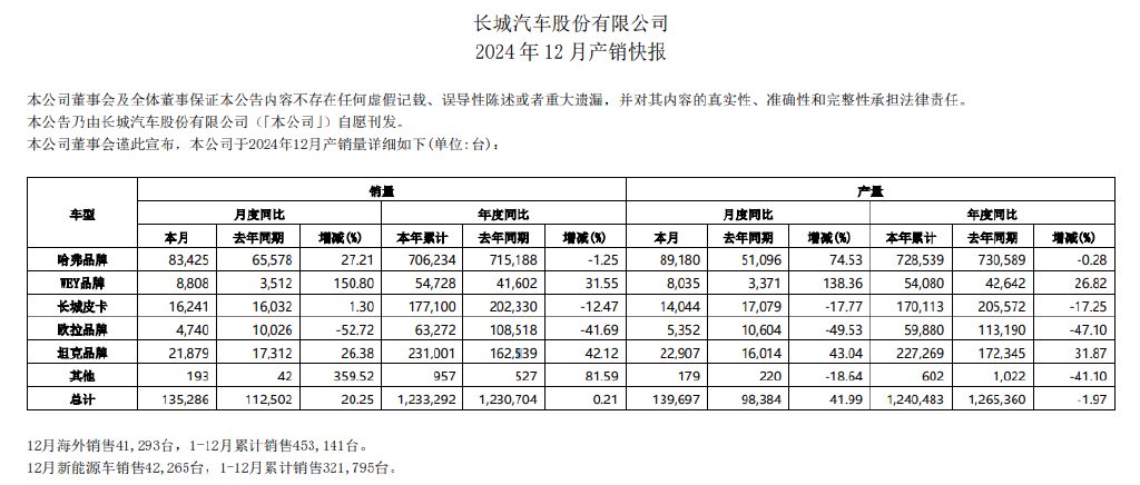 需要说明的是,长城汽车2024年销量使用的是产销数据快报,之前的销售成绩则使用的是年报数据,其与当年公布的产销情况有细微的差异。