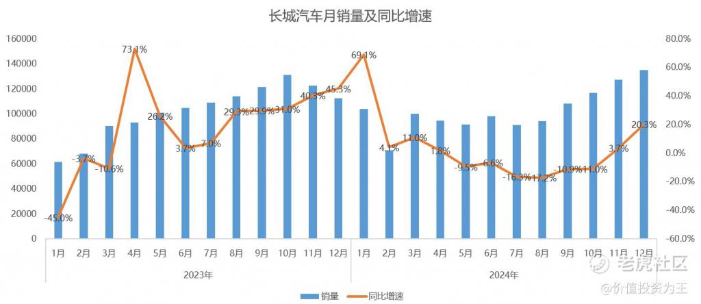 除此之外,长城的汽车销量算不上好,去年 12 月同比仅增长 20%,远不及比亚迪的 51%: