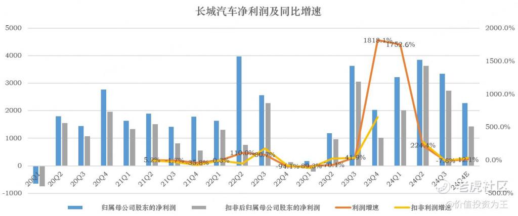 单看去年四季度,长城汽车净利润约 22.7 亿,同比增长仅 12%。扣非净利润增速略快一些,达到了 39%,但与全年 100%左右的增速相比,黯淡不少:
