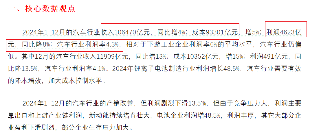 乘联分会秘书长崔东树27日发文称:2024年1-12月的汽车行业收入106470亿元,同比增4%;成本93301亿元,增5%;利润4623亿元,同比降8%;汽车行业利润率4.3%,相对于下游工业企业利润率6%的平均水平,汽车行业仍偏低。