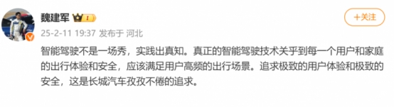 近日,行业领军人物接连发声引发热议。华为常务董事、终端BG董事长、智能汽车解决方案BU董事长余承东发文“智能驾驶,凑合能用与好用并安全,是完全不同的境界”,强调智能驾驶从“可用”到“好用且安全”是巨大跨越,而长城汽车董事长魏建军也通过自己的微博账号发文指出智能驾驶需注重实践,关乎用户体验与安全,要契合高频出行场景。他们的观点为行业指明方向,二者观点殊途同归——唯有将技术沉淀与场景验证深度融合,才能真正实现智能驾驶的价值闭环。
