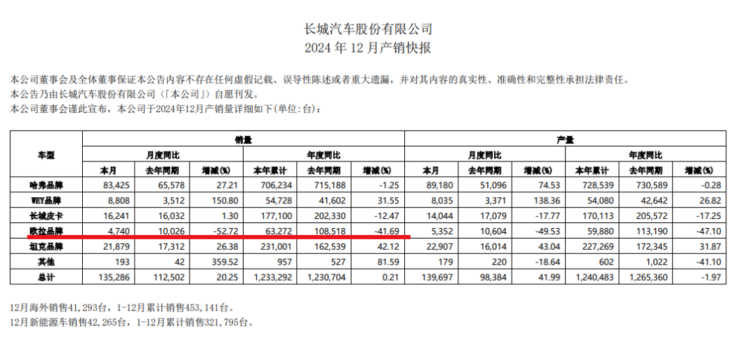 整个2024年,欧拉品牌销量仅有63272辆,虽然同比大跌41.69%,但其在长城汽车整体比重尚有5.13%。