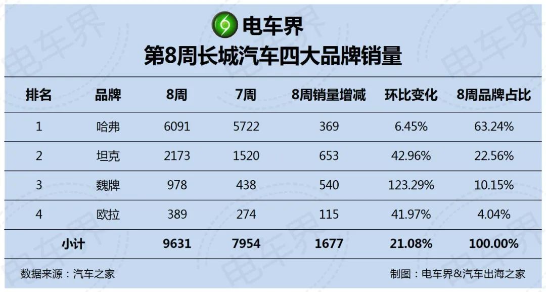 坦克品牌第8周销量2173辆,环比大涨42.96%,占整体比重22.56%。