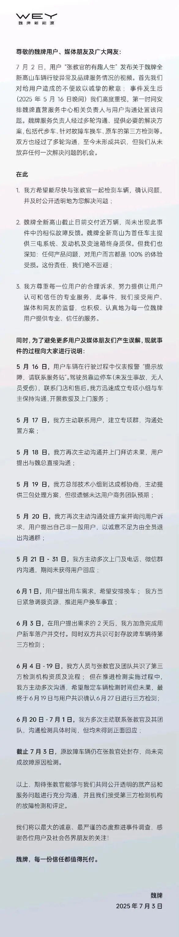 7 月 3 日,魏牌发布详细"沟通日历",称已提供代步车、换新车、第三方检测等方案,但博主拒绝接受。魏牌特别指出,博主自称"非一般用户",坚持要求"与魏总直接沟通",并多次以"诚意不足"为由拒绝检测。魏牌强调,高山车型交付近万辆,未出现同类故障,承诺终身质保,"绝不回避责任"。