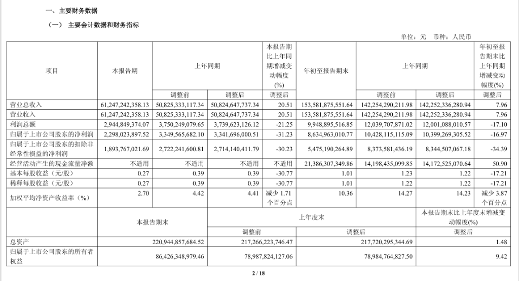 从年初至报告期末的整体表现来看,公司前三季度累计营业收入为1535.82亿元,同比增长7.96%,但更能反映主营业务盈利能力的“扣除非经常性损益的净利润”仅为54.75亿元,同比大幅下滑34.39%。