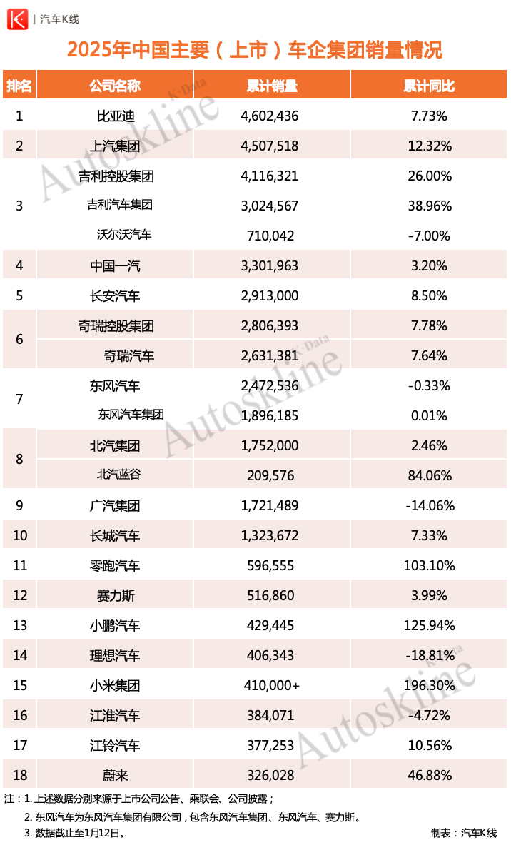 在《汽车K线》统计的2025年中国主要上市车企集团销量情况中,长城汽车销量为132万辆,位居第10。