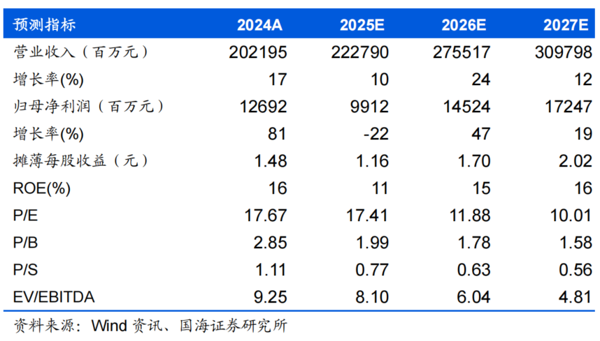 公司海外竞争优势稳固,盈利确定性较高,随未来产品推出,公司销量整体趋势向上,预计公司2025-2027年实现营业收入2228、2755、3098亿元,同比增速为10%、24%、12%;实现归母净利润99.1、145.2、172.5亿元,同比增速为-22%、47%、19%;EPS 为1.16、1.70、2.02元,对应当前股价的PE估值分别为17.4、11.9、10.0倍。我们预计公司未来收入等业绩指标持续向好,看好公司未来发展,维持“增持”评级。