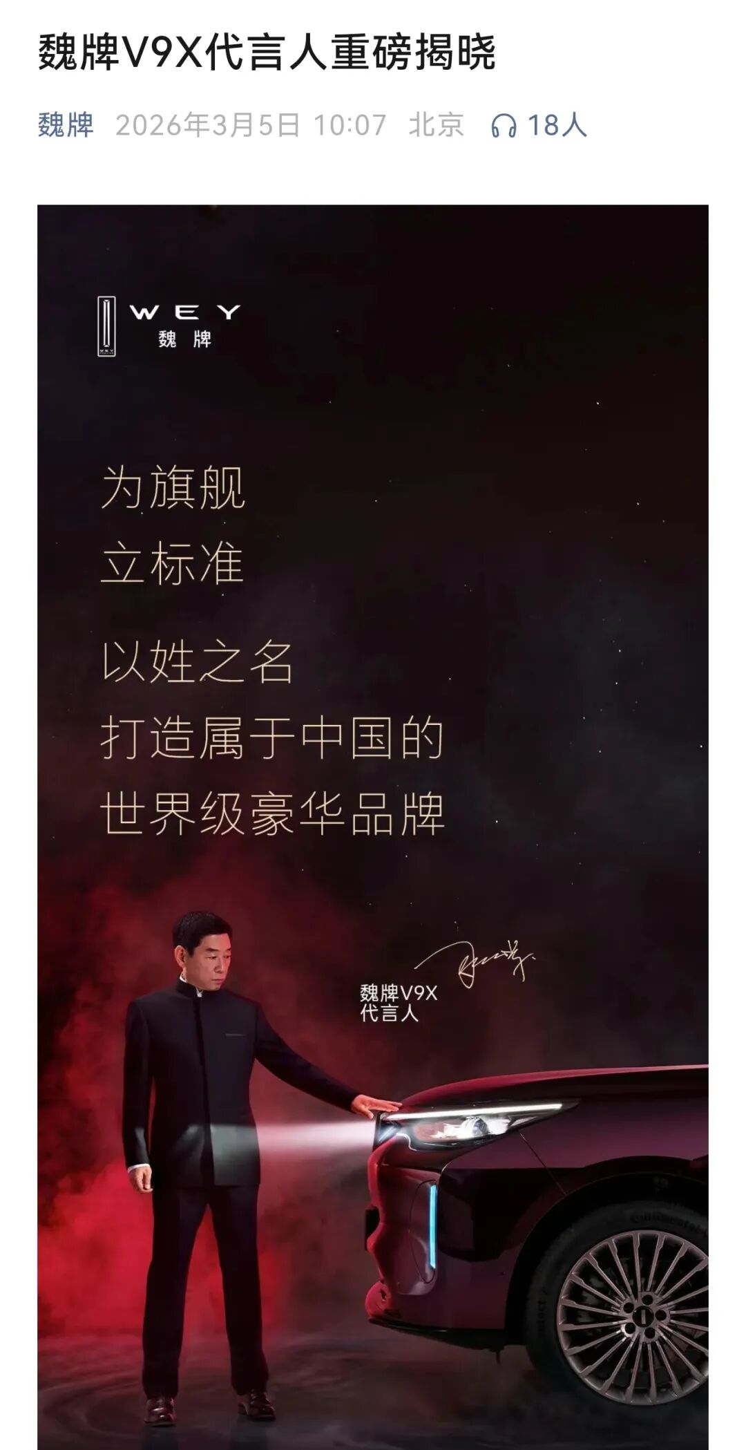 电动知家消息,今天长城汽车官方重磅宣布,长城汽车董事长魏建军成为其旗下魏牌全新旗舰车型V9X代言人。长城汽车在官方宣传海报写到,为旗舰立标准以姓之名打造属于中国的世界级豪华品牌。