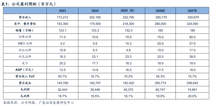 (2)WEY品牌:公司25年MPV新车型高山持续兑现爆款,考虑到公司主流新平台新车的集中上市、高端方盒子SUV的竞争格局较好和直营门店的建设,预计WEY品牌26-27年的销量分别为20/27万辆;