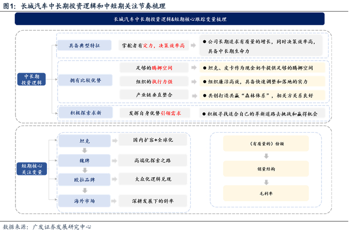 站在当下,我们基于公司的新一轮周期变化,我们认为公司又在做一轮自己擅长的事情,其中坦克品牌的全球化将成为公司新一轮向上发展“新”周期的核心支持变量,进一步打开公司的盈利天花板,同时为公司的高端化和主流新能源转型提供底层支撑。