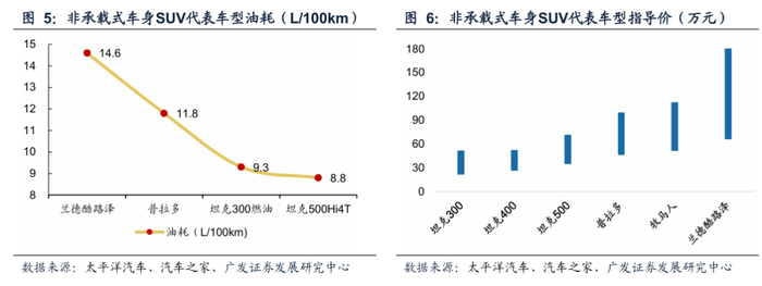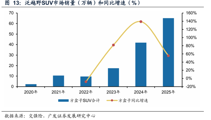 长城哈弗、奇瑞捷途和比亚迪方程豹2020年以来持续推出优质供给,拉动“方盒子”SUV市场持续扩容。根据交强险,2025年“方盒子”SUV市场销量为65.1万辆,同比+55.7%,创历史新高。“方盒子”SUV通常为承载式车身,满足消费者个性化需求的同时,使用成本较非承载越野车型大幅降低。