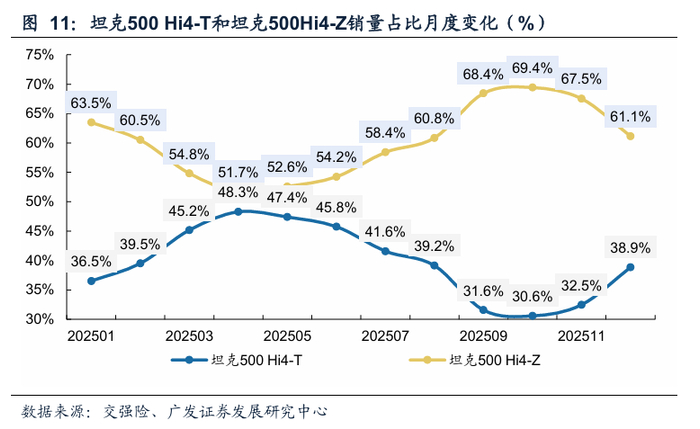 Hi4-Z上市以来坦克品牌在非承载车身SUV市场中月度份额企稳回升。根据交强险,2025年非承载车身SUV市场中坦克/哈弗/丰田/比亚迪/北汽的销量分别为17.6/7.0/7.2/3.5/2.4万辆,份额为43.0/17.2/17.7/8.6/5.9%。其中坦克品牌在25年8月坦克500 Hi4-Z上市后份额整体呈现回升趋势,其中在25年12月的份额为43.4%,同比+3.0pct,主要系坦克500/坦克400智驾版Hi4Z的拉动。
