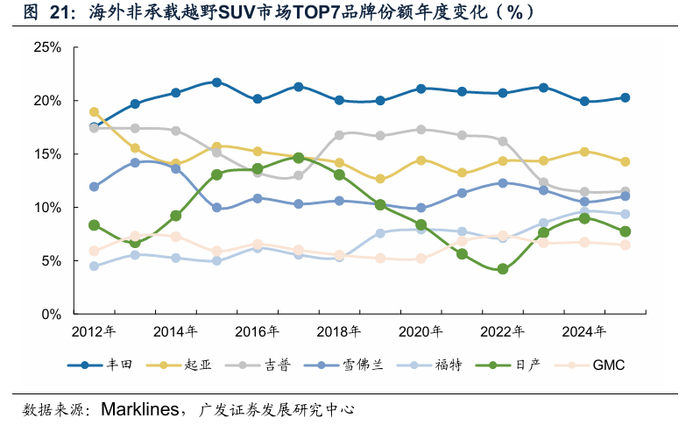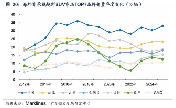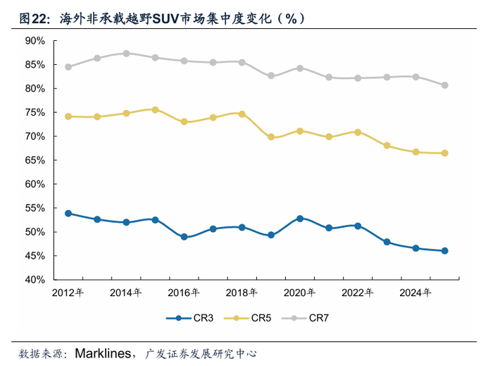 海外非承载车身SUV市场20年以来品牌集中度呈现下滑趋势。根据Marklines数据,2025年海外非承载车身SUV市场CR3/CR5/CR7分别为44.6/64.4/78.1%,较2020年分别下滑8.2/6.7/6.1pct。预计随着以长城汽车坦克品牌为代表的车型加速出海,行业集中度或进一步下降。