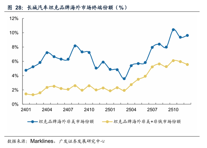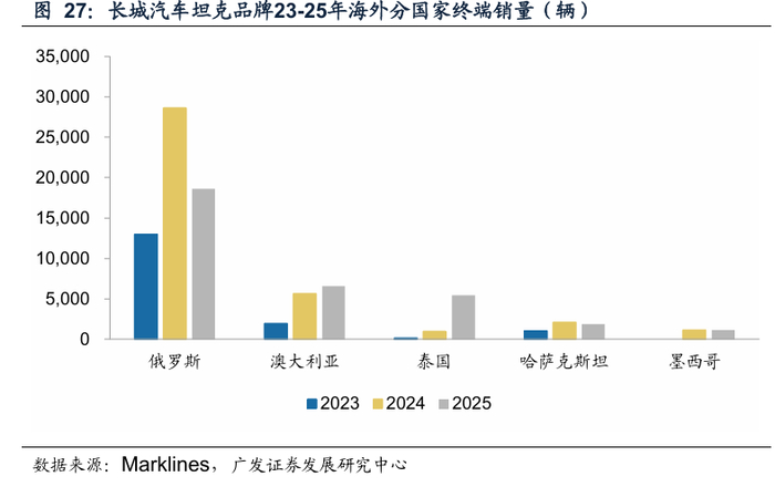坦克品牌海外终端份额持续提升,中长期视角下销量中枢有望进一步上移。根据Marklines,2025年坦克品牌海外/非俄地区终端销量为4.4/2.5万辆,同比分别+4.7/+91.1%。分国家来看,坦克品牌25年在俄罗斯/澳大利亚/泰国的销量分别为1.9/0.7/0.5万辆。从海外非承载越野SUV市场份额来看,坦克品牌25年在海外非美/非美俄地区的份额提升至6.8/4.0%,同比分别+0.5/2.0pct。
