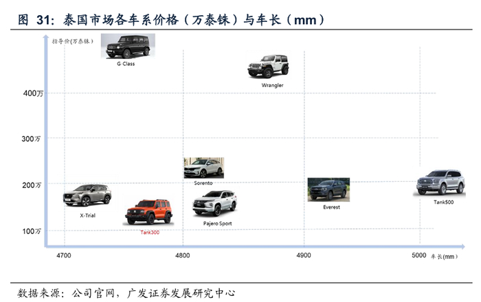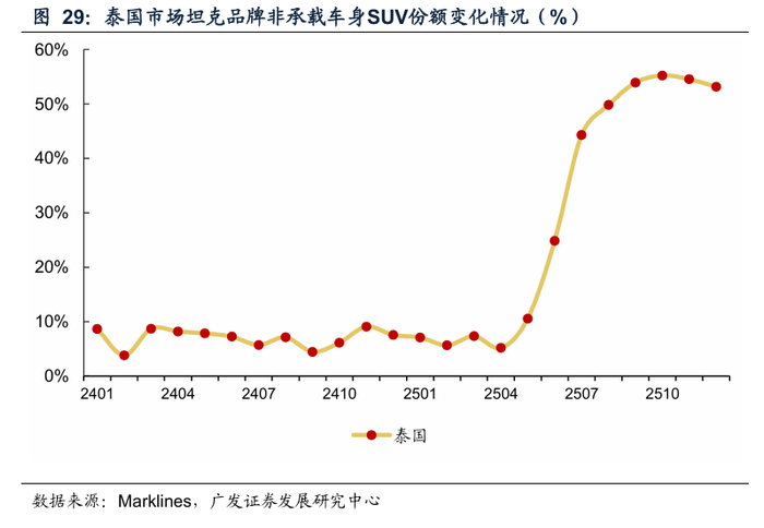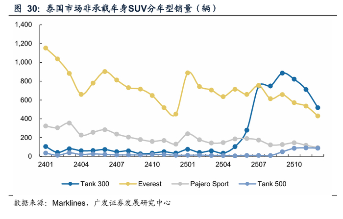 以泰国市场为例,坦克品牌凭借性价比优势,在泰国非承载车身SUV市场份额中枢快速上移。根据Marklines,2025年12月坦克品牌在泰国市场的销量为607辆,在非承载车身SUV里面的市场份额快速提升至53.2%。坦克300/500凭借空间、价格上的优势体现性价比,持续抢夺外资品牌份额。
