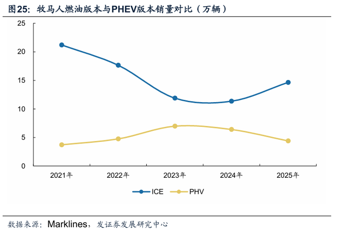受益于混动技术降低使用成本,海外非承载式PHEV市场需求快速提升。以牧马人为例,自2020年北美上市牧马人4xe,通过2.0T+双电机技术方案在保留越野性能的同时实现低油耗,解决了传统越野车的高油耗痛点。根据Marklines,2025年牧马人PHEV版本销量达4.4万辆,PHEV销量占比为23.1%。