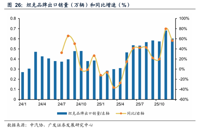 坦克品牌出口销量持续提升,当前主要是坦克300/500的燃油版贡献增量。根据中汽协,2025年12月坦克品牌出口销量为0.6万辆,同比+56.4%。其中坦克300/500的12月出口销量分别为0.4/0.2万辆,同比分别+51.8%/+42.7%。后续随坦克400/700新车型的出口和坦克品牌PHEV车型的出口,坦克品牌出口销量中枢将进一步上移。