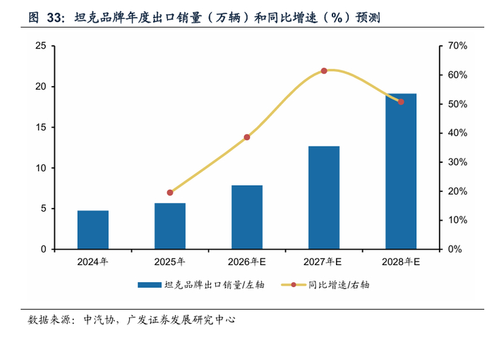 往后展望,坦克品牌有望成为海外市场越野需求的引领者。国内市场中坦克品牌已经证明过相比外资品牌的优势,坦克品牌在海外市场有望凭借性价比优势和PHEV技术的引领者角色,实现海外终端份额的进一步提升。考虑海外分国家非承载SUV市场的持续扩容,坦克品牌更多车型和动力类型的出口供给拉动份额提升,我们预计26-28年坦克品牌的出口销量分别为7.9/12.7/19.1万辆,同比分别+38.6/+61.4+50.8%,后续我们将核心跟踪澳大利亚、泰国、中东和北美地区坦克品牌的月度销量。