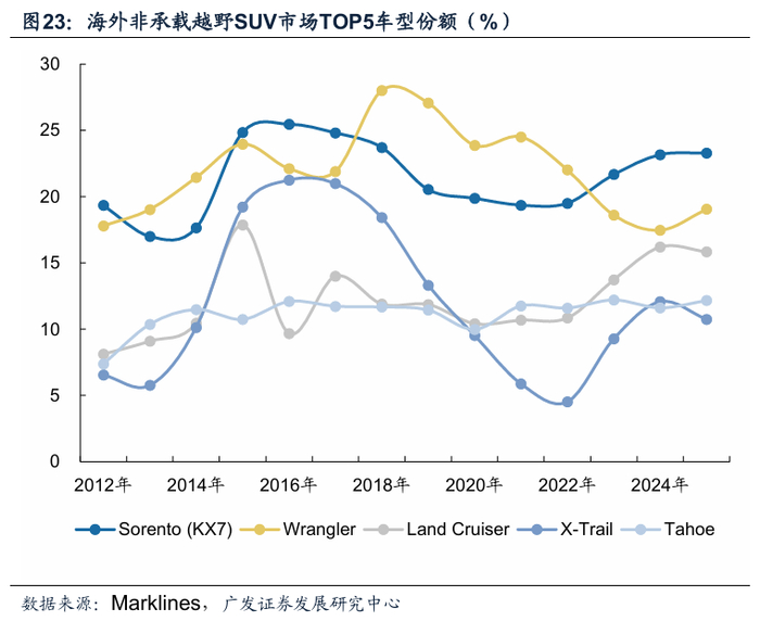 海外非承载车身SUV市场品牌集中度较高。根据Marklines数据,2025年丰田/起亚/吉普/雪佛兰/福特在海外非承载车身SUV市场中的销量分别为33.1/23.3/18.8//18.0/15.3万辆,同比分别+8.0/+0.5/+7.4/+12.4/+4.5%,市占率分别为20.3/14.3/11.5/11.1/9.4%。