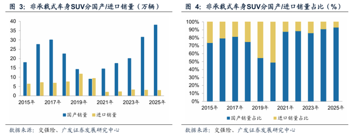非承载车身SUV市场中进口车型占比持续下降。历史复盘来看,2017年国内非承载式车身SUV市场规模达到36.9万辆的历史高点。随国内乘用车排放标准升级,海外品牌因没有相应开发符合排放标准的车型,进口销量逐步下降的同时,部分外资品牌的国产车型也从2021年开始阶段性停产。非承载式车身SUV进口车型销量在2018年达到11.7万辆,2025年下降至2.9万辆。