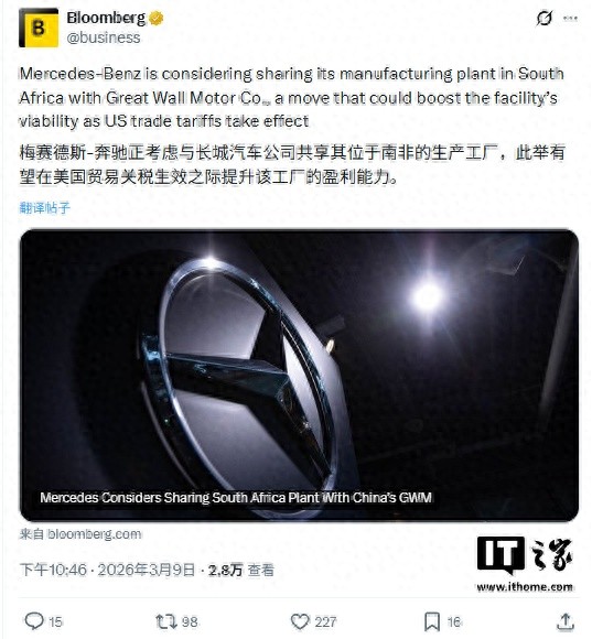 IT之家 3 月 10 日消息,彭博社昨日报道称,梅赛德斯-奔驰集团正考虑与中国长城汽车就共享其位于南非的制造工厂,此举旨在提升该工厂的运营可行性,以应对美国贸易关税政策带来的冲击。据知情人士透露,双方已就位于港口城市东伦敦的工厂开展联合生产进行洽谈。