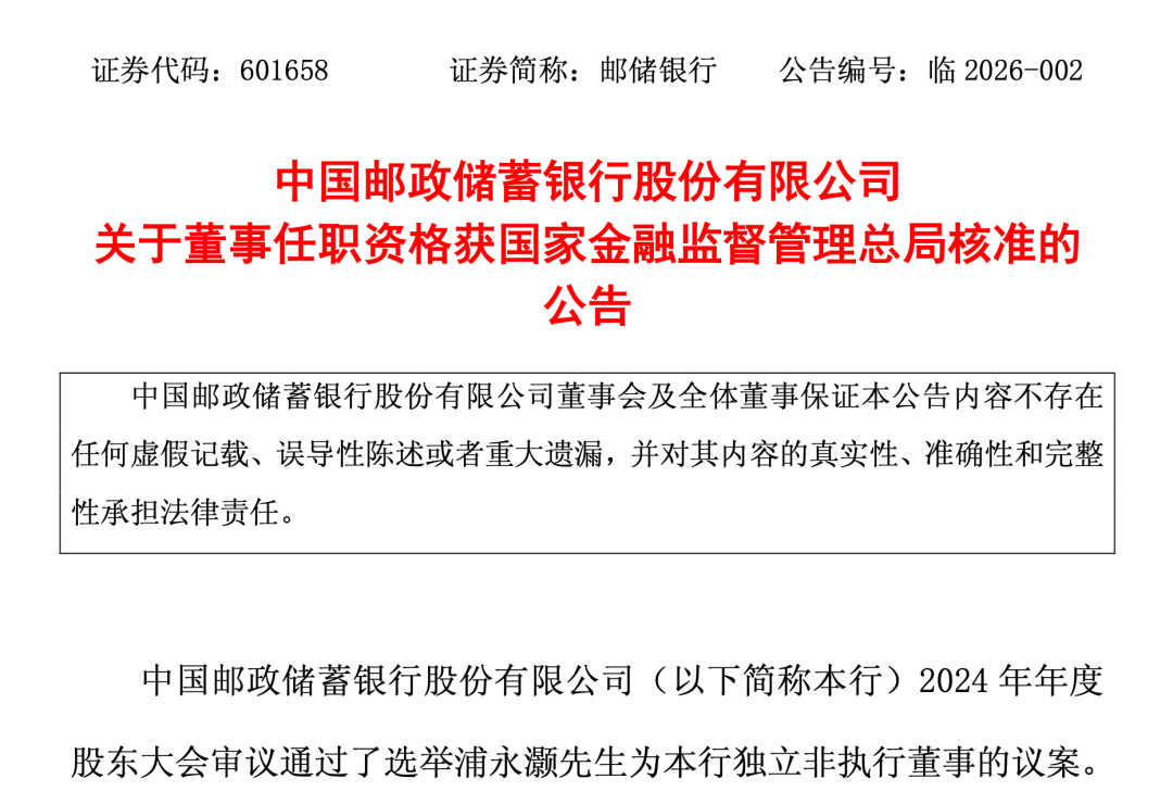 早在2024年年度股东大会上,选举浦永灏先生为本行非执行董事的议案就已审议通过。近日,邮储银行收到《国家金融监督管理总局关于浦永灏邮储银行董事任职资格的批复》(金复〔2026〕27号),标志着浦永灏先生任职资格正式获批。