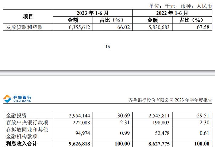 齐鲁银行利息收入的主要构成部分为发放贷款和垫款、金融投资。今年上半年,齐鲁银行实现利息收入96.27亿元,较上年同期增长11.58%。