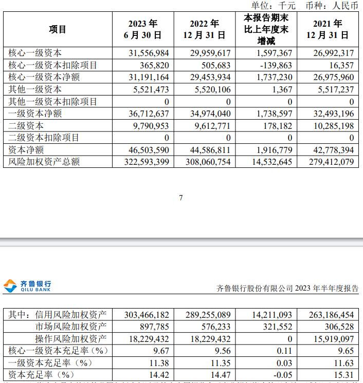 截至今年6月30日,齐鲁银行资本充足率14.42%,去年末为14.47%;一级资本充足率11.38%,去年末为11.35%;核心一级资本充足率9.67%,去年末为9.56%。