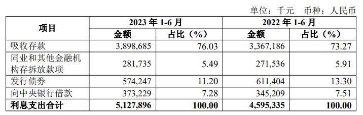 该行利息支出的主要构成部分为吸收存款、发行债券、向中央银行借款及同业和其他金融机构存拆放款项。今年上半年,齐鲁银行利息支出51.28亿元,较上年同期增长11.59%。