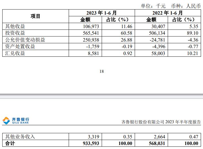 今年上半年,齐鲁银行实现投资收益5.66亿元,上年同期为5.06亿元。