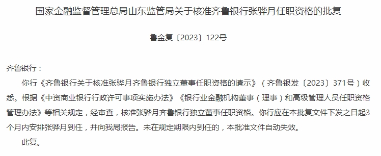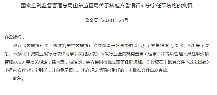 10月25日,据国家金融监督管理总局山东监管局的批复,齐鲁银行多名董事、独董以及首席信息官任职资格获批。