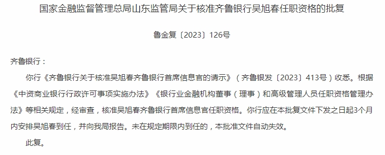 另据鲁金复〔2023〕126号,山东监管局还核准了吴旭春齐鲁银行首席信息官任职资格。