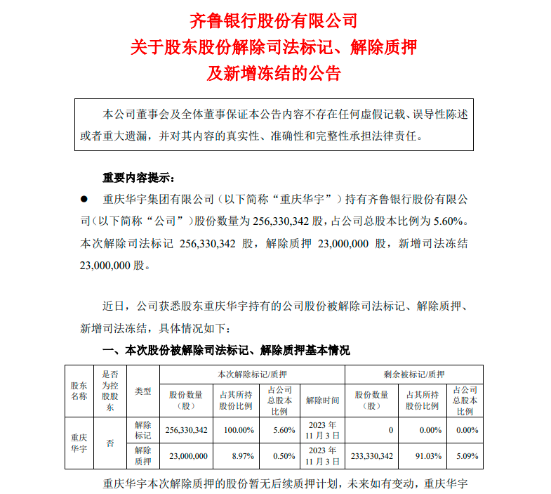 今日,齐鲁银行发布公告称,公司股东重庆华宇集团有限公司(以下简称“重庆华宇”)持有的公司股份数量为2.56亿股,占公司总股本比例为5.60%。重庆华宇日前被解除司法标记2.56亿股,解除质押2300万股,并新增司法冻结2300万股。