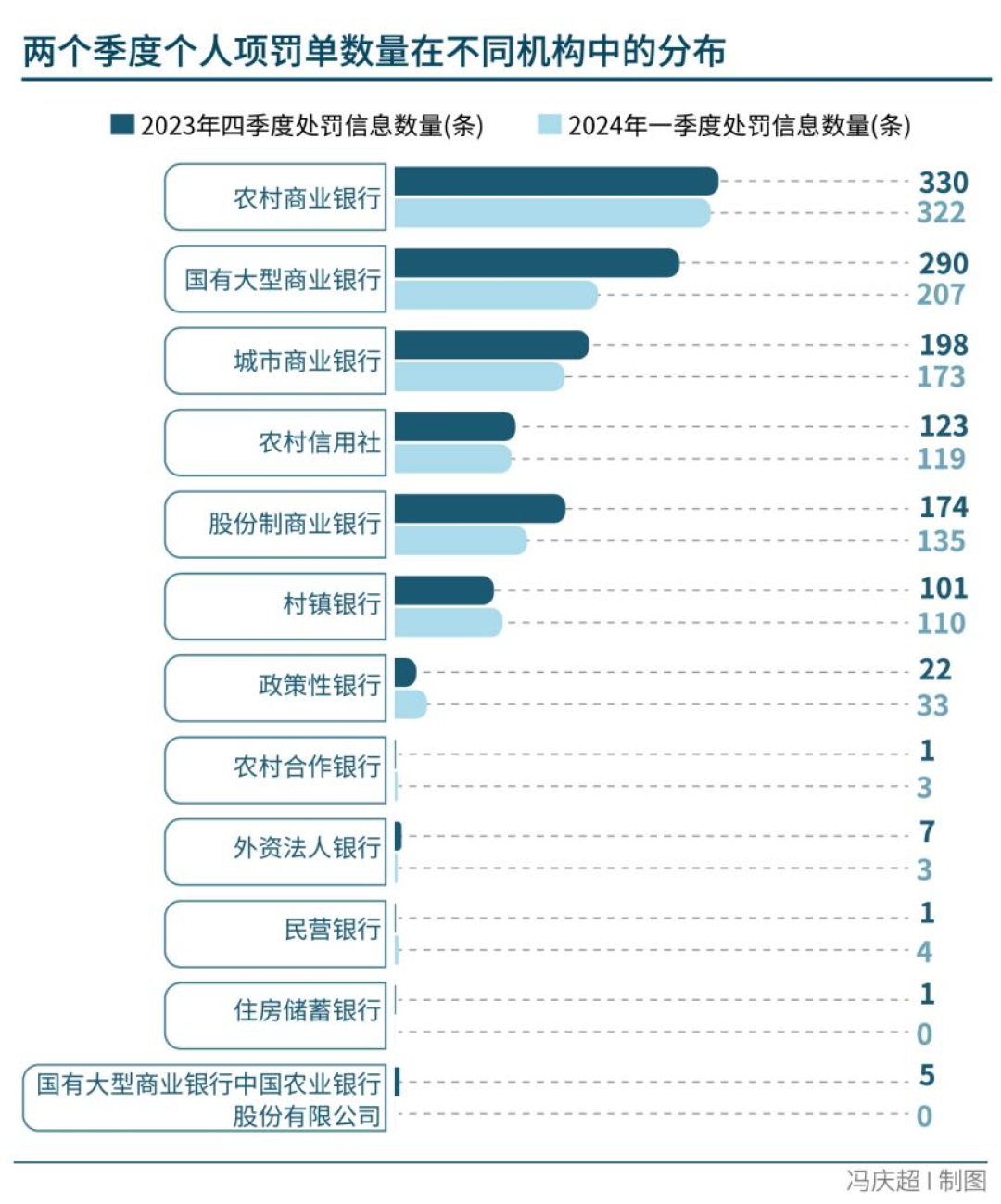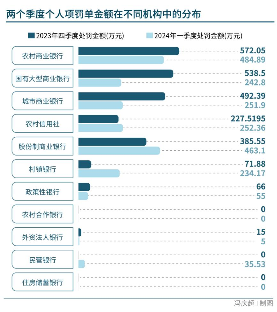 南方周末新金融研究中心梳理发现,一季度,在个人项罚单中,农商行从业者的罚单数量和金额在被罚机构中排名第一;与此同时,在机构项罚单中,农商行收到的罚单数量和被罚金额亦居首位。更值得注意的是,农行商受罚情况环比未出现明显变化。这意味着农商行违规经营行为依然未得到有效改观。