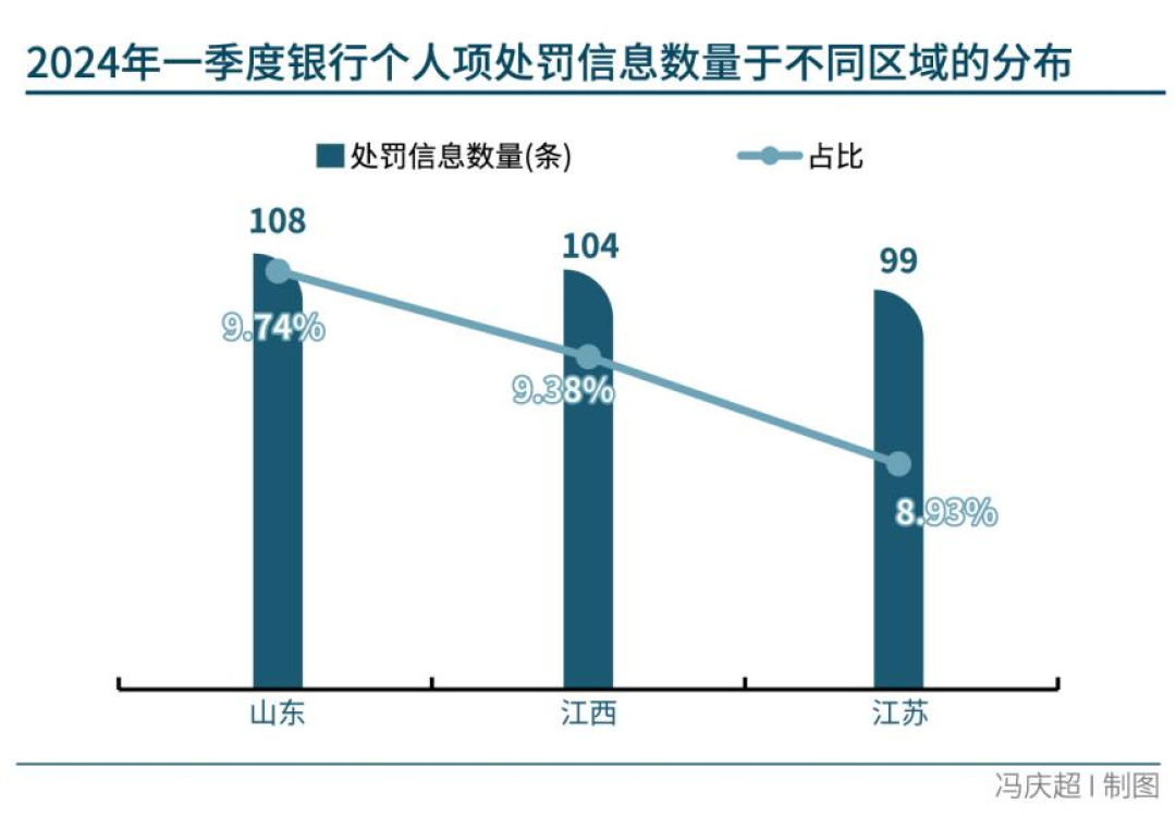 南方周末新金融研究中心统计分析牧羊犬平台数据发现,一季度,山东、江西和江苏三地的罚单信息量位居前三。其中,山东个人项罚单和机构项罚单数量最多,分别为 108条和75条。此两项指数最少的地区分别是宁夏(1条)、西藏和天津(均为2条)。